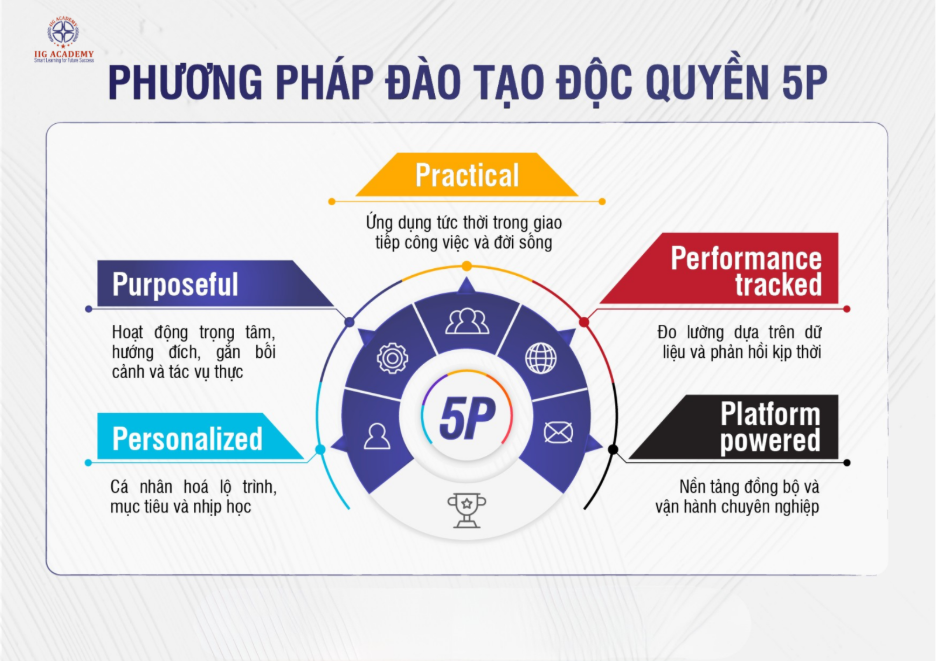 Hiệu quả của khóa học tiếng Anh giao tiếp tại IIG Academy được bảo chứng bởi phương pháp đào tạo độc quyền 5P, được nghiên cứu và phát triển bởi đội ngũ chuyên gia giàu kinh nghiệm, đảm bảo tính phù hợp cao với môi trường doanh nghiệp.